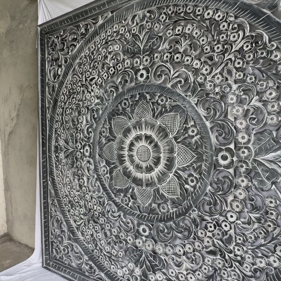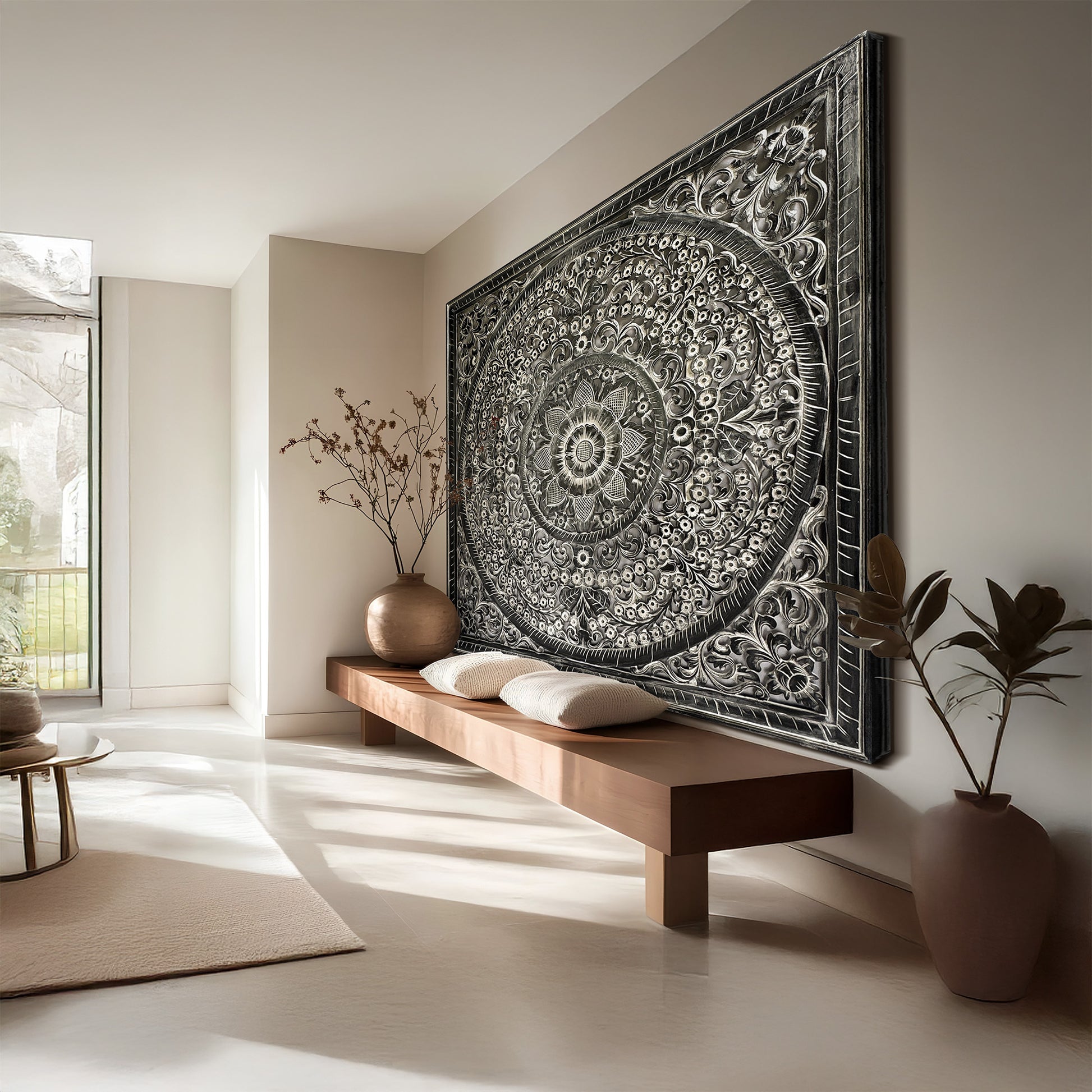 The intricate carving draws inspiration from the mandala symbol, representing the center of the universe and creating a serene, balanced atmosphere.